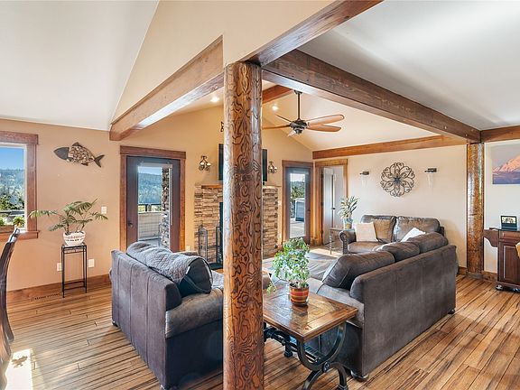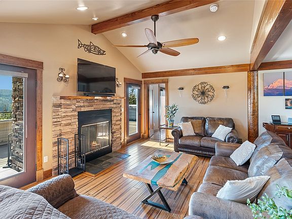 **Discover a breathtaking retreat nestled on just over 1.6 acres, boasting panoramic territorial & water vistas. Step inside to be greeted by the allure of bamboo flooring, accentuated by the warmth of wood columns and beams. Cozy up beside by the wood-burning fireplace, ensuring warmth & comfort. The gourmet kitchen, an epicurean's delight, commands attention with its seamless flow into the inviting living room. Outside, an expansive deck beckons, complete with an outdoor fireplace, inviting hot tub, & ample seating, offering a serene oasis for relaxation & enjoyment. RV or boat parking on the side of the garage caters to your adventurous spirit. Welcome to your own slice of paradise.
