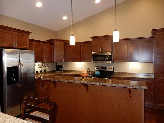 Beautiful 1-story townhome which has a very open floor plan. Kitchen, dining and living room have vaulted ceilings, as well as the master bedroom and sunroom. The rest of the home finishes off with master bedroom with walk-in closet and bath, 2nd bedroom, hall bath, laundry in hallway. Association fee covers lawn, snow and exterior insurance.