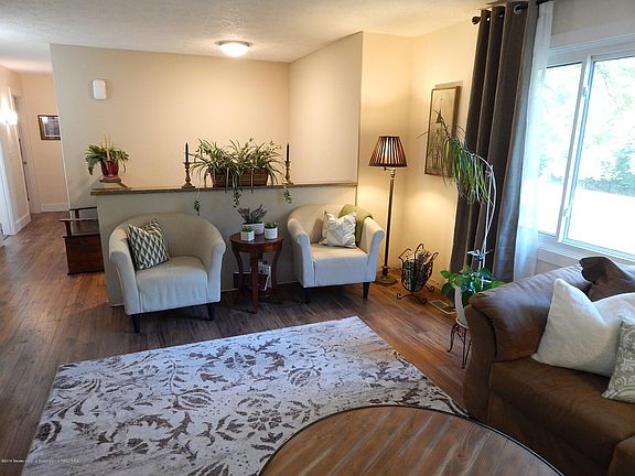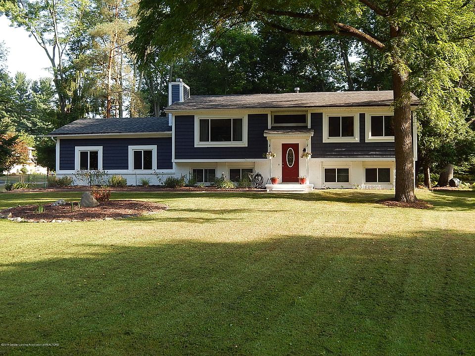 Okemos! Fabulous river views from this approx. 1,796 sq. ft. raised ranch home. Walking distance to Cornell Elementary School. Majestically nestled on a beautiful mature lot! Very deceiving, must see to believe! Beautifully updated inside and out. Stunning new kitchen including beautiful cabinetry with soft close doors & drawers, quartz counter tops, generous center island, tiled flooring, subway tile back-splash, and charming eating space with direct deck access. Fabulous living area with laminate wood look flooring. Lovely master suite. Beautiful newer main bath with quartz counter tops, fabulous vanity with double sinks, subway porcelain tile shower. 2 bedrooms on the main floor. The lower level boasts a half wall stone like fireplace in the wonderful family room, 2 bedrooms on this level, new full bath with a slate counter top, and direct access to the 2 car garage from the lower level. Windows 2019 (except 2). new doors plus trim on the main floor. Large yard with a pretty tree f
