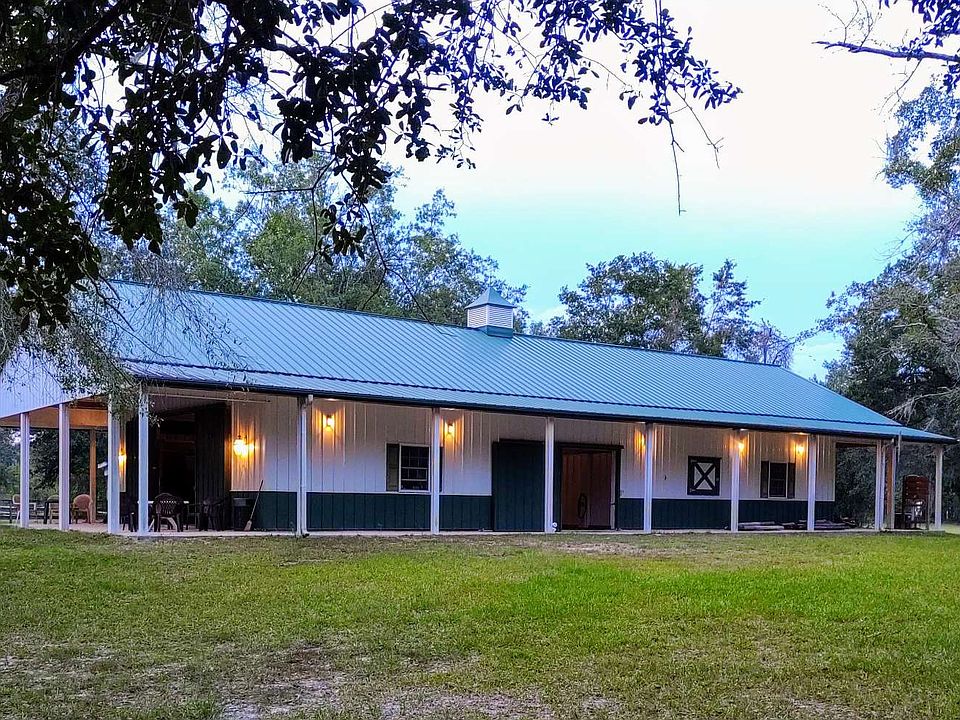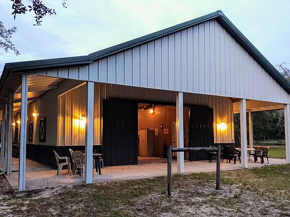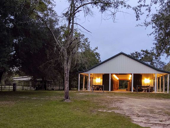 Calling ALL Equestrian Lovers! 83.21 Horse Ranch with 4/2 home, 7 stall horse barn (Morton Builders) with office and full bath. Complete with tack room, hot water wash station and birthing stall. Stamped concrete. Mechanic shop, Wood working shop, RV barn, hay barn, fully stocked fish pond (has own well) with gazebo and dock. Interlocking fence, horse turn out. Scattered trees, beautifully kept landscape.