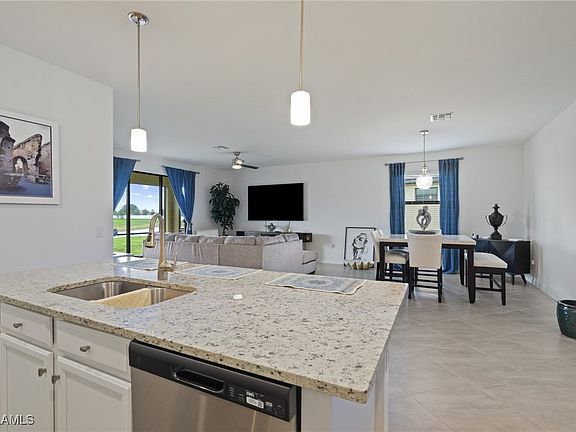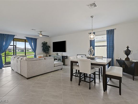 At the heart of the home is a spacious kitchen with a central island, breakfast bar, stainless steel appliances, and a seamless flow into the dining and living areas—ideal for everyday comfort and entertaining. The living area opens to a screened lanai overlooking the water, creating the perfect space to relax and unwind.