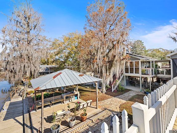 Beautiful one owner home on the lower Amite River. Located on Head of Island, within 5 miles of several restaurants and fun places! Very quiet location with no through traffic. Three bedrooms, 2 full and 2 half baths. The primary suite is separated from the living area by an open breezeway and features a wet bar, private screened deck overlooking the water, sitting area, huge custom walk-in shower, custom built bookshelves, and a large, walk-in closet. A large, glassed-in sunroom with French doors can be found just off of the large living room and kitchen. An elevator accesses the upstairs. A back set of stairs leads to a firepit, covered pier with fish cleaning station, raised bed garden with sprinkler system, a covered deck connects to a second deck via a quaint bridge. A greenhouse can also be found on the grounds. An office, complete outdoor kitchen and an extra large “man cave” with additional storage space, covered rv port with a 30 AMP hookup. All of this is fenced for pets and privacy. There is under house concrete pad parking. The boat lift features a 2 story sundeck. There are several sitting areas on and off of the water. This is a fantastic entertaining property with an entertainment system and surround sound downstairs. 24 panel solar system installed. Truly a property you have to see in person to fully appreciate.