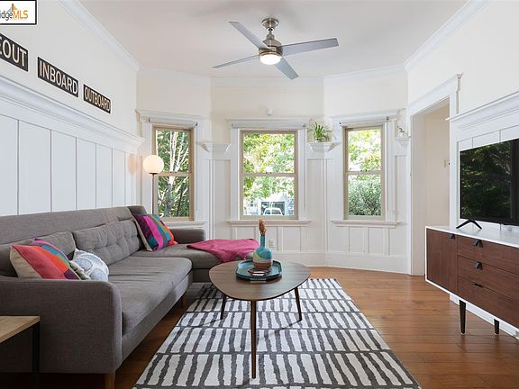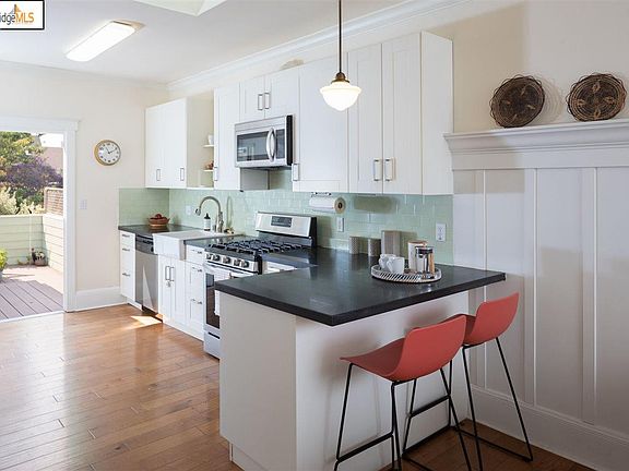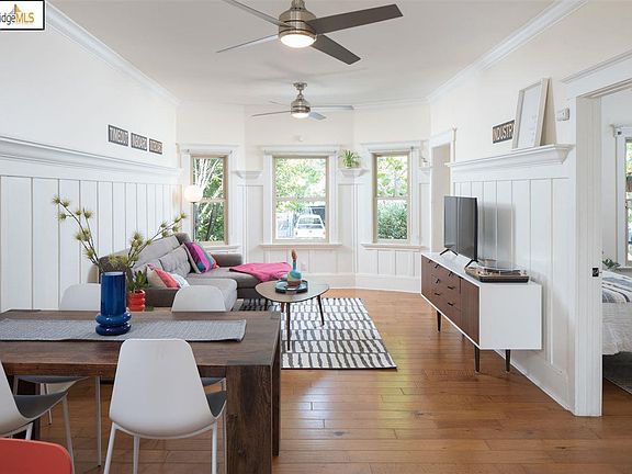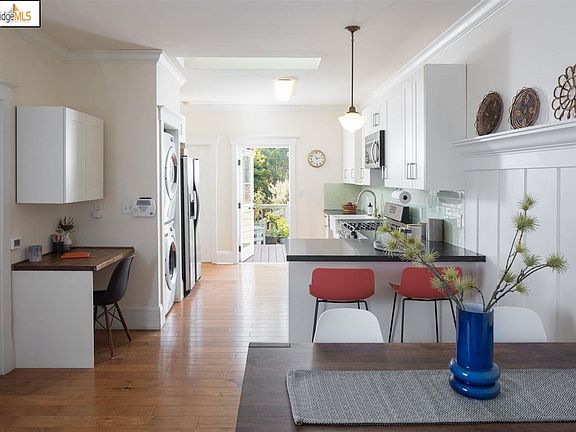 This efficient and charming 2 bedroom, 2 baths in Oakland's artistic and multi-use Dogtown neighborhood is the perfect starter home. It has a modern open floor plan with updated kitchen and bathrooms, yet maintains the sweet original details you would expect from this era. Features include hardwood flooring throughout with radiant floor heating, stackable washer/dryer, skylights, ceiling fans, garage, and plentiful basement storage. In addition, there is a large main bedroom with ample closet space and an ensuite bathroom. Both the main bedroom and the kitchen lead out onto a sunny private patio that connects to the larger private garden with high fences, mature trees, grass and automatic sprinklers.