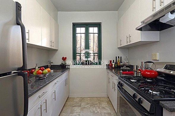The one-bedroom Contemporary Apartment has ample space, lots of sun, traditional styling and best of all ? the most up-to-date kitchen finishes and modern appliances. Select from one of the two kitchen choices in either Arctic Ribbon or warm cherry. The cool tones of the Arctic Ribbon finish with sleek off-white and grey cabinets are complemented by slate grey granite countertops. The second kitchen finish features Warm Cherry cabinets with matching rose-toned granite countertops for a classically elegant look. And of course, residents have access to all the usual onsite amenities: Macy?s, supermarkets, blink Fitness, express bus service, the Parkchester subway stop (30 minutes to midtown), parks and 24-hour roving security.