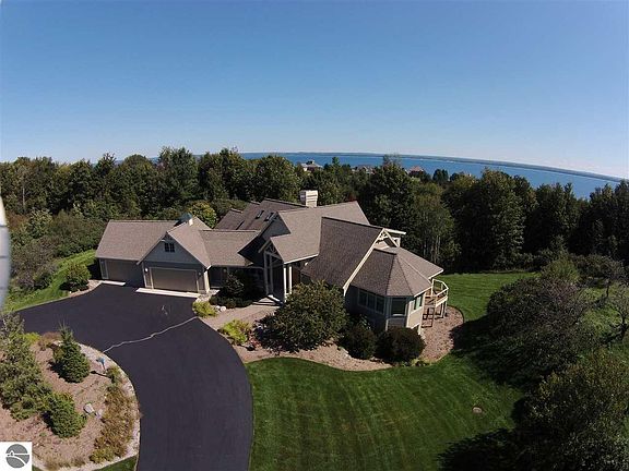 This home is situated on an estate setting overlooking East Grand Traverse Bay and is surrounded by Old Mission Peninsula's natural beauty and nearby cherry farms. Every inch of this custom home was planned out with great care and consideration. Some of the many features, are soaring ceilings with oversized windows top to bottom providing an abundance of natural sunlight and great views of the water and surrounding countryside. A cook's kitchen with maple cabinets, solid-surface counters, island and multiple pantries. The kitchen opens into the dining area as well as an adjacent solarium with peaked ceilings and windows all around. Main floor office is adorned by leaded-glass doors and opens to the outside deck. Master bedroom features walk-in closets and a spacious bathroom with walk-in shower, soaking tub, heated tile floors and duo-sink vanity. The finished walk-out lower level houses two spacious bedrooms, large bathroom, wine room and kitchenette...great for entertaining and housing guests. Additional features are a four-car heated, attached heated garage with two bonus rooms above and hot and cold water. House is prepped for an elevator and offers additional space for an indoor workshop, media room or fitness room (whatever one would like). Features are endless. This is a one-of-a-kind home.