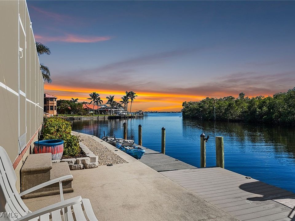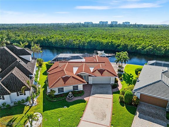 Live the Boater’s Dream in Palm Acres! Step out onto your lanai and pool deck to enjoy breathtaking sunrises every morning—this is paradise found! Located in Palm Acres, Fort Myers' best-kept boating secret, this stunning home offers deep water direct Gulf access and is just minutes to open water. Set on a desirable pie-shaped lot, this meticulously remodeled ranch-style home boasts over 2,347 sq. ft. of living space, 3 bedrooms, a flex room, and 3 full baths. Designed with Florida living in mind, the home is filled with natural light and features an open floor plan perfect for entertaining. Pocketing sliders seamlessly connect spaces for the quintessential indoor-outdoor lifestyle. Tile flooring flows throughout, and hurricane protection ensures peace of mind. The chef’s kitchen is a showstopper with quartz countertops, a large island, a stunning backsplash, and stainless steel appliances. A separate morning kitchen includes a refrigerator/freezer drawer, sink, and hidden swing-out platforms for a clean, sleek look. Formal dining with water views completes the space. The primary suite is a serene retreat with lanai access, an ensuite bath featuring dual vanities with quartz countertops, a walk-in shower, and a cleverly tucked-away washer and dryer. The second bedroom also includes an ensuite bath with a walk-in shower. The third bedroom is generously sized. There is a 20,000 lb. boat lift and a composite dock. Your heated pool has lots of pavered decking to relax and enjoy the view. Additional features include: