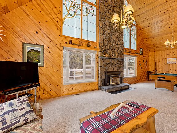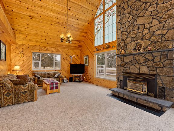 Discover your personal sanctuary in this charming chalet, where warmth and nature converge. Featuring big pinewood ceilings and a vaulted great room, this home exudes an inviting atmosphere perfect for relaxation. Cozy up by the warm propane fireplace and let the beauty of the big stained-glass windows fill your space with color and light.