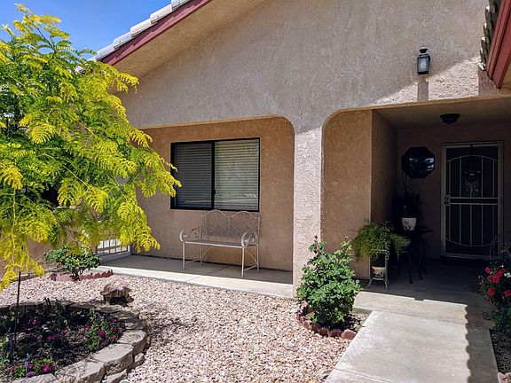 CHEERFUL AND BRIGHT, this golf course beauty will make you feel right at home! Beautiful courtyard and front sitting area. Living room and kitchen/dining area open to the beautiful green of the golf course and a lovely covered patio to enjoy those views! Large living room with lovely fireplace and bookshelves. Kitchen has had some upgrades. Solid oak cabinets with sizeable breakfast bar and huge built-in hutch as well as desk. Master bedroom with en suite and walk-in closet. Two more large bedrooms and a hall bath. Skylights for additional natural light. Huge garage! Full two car plus a golf cart door and path right to the course. Lots of storage area. Front and back yards nicely landscaped with rock and pretty foilage. Wall evaporative cooler saves you $$ in those warmer months. Brand new carpet! Take a look...you will love this home!