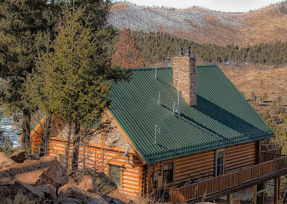 Beautiful custom log home overlooking Pine Lake with amazing views of Thunder Butte, Bell Rock and Sheep's Nose. This Custom Swedish Coped log home sits on 3.66 acres, has 2604 finished sq. ft. with 4 bedrooms, 3 bathrooms, huge walk-out family room with a fireplace, and is located ONLY 20 minutes from Woodland Park yet feels like you're in the middle of the Colorado Wilderness. The main level is all hardwood floors with a vaulted ceiling, has a great wood burning fireplace insert, and walks-out to a huge deck. Paradise served by a private lake called Pine Lake that is full of Brown Trout and Rainbow Trout. It is one of the few private lakes that allows members to swim and recreate in and on the water. There are beaver dams and ponds throughout the area, and wildlife are everywhere. No need to trailer you OHV's, as you can ride from the property to the Rampart Range Trailhead. This property has plenty of recreational areas surrounding it: Gold Medal Waters for fishing, National Forest for Hunting, OHV trails, World Class Jeep Trails, World Famous Climbing at Turkey Rock and Sheep's Nose, Lost Creek Wilderness for horseback riding & Buffalo Creek for mountain biking all are within either riding distance or a 30 minute drive. Make it your permanent dream home or your weekend retreat as Colorado Springs and Denver are both just over an hour's drive.
