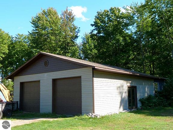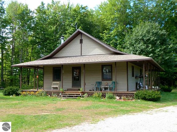 Wonderful 5 acre country package in a private setting that backs to acres & acres of State land! Sweet home built in 2002 with full wrap around porch, full unfinished basement plus large pole blding garage (30x40 + 24x24 addition). Wood burning fireplace, wood & carpeted floors, open vaulted ceilings, nice large kitchen & open great room living areas. One bedroom & one large full bath + plus laundry room on the main level. (Basement could accommodate 2 more non-conforming bedrooms). Hi Eff furnace. Lrg pole garage is prepped for 200 amp service, (2) 9 ft doors plus back doors,2 sets of water lines, dirt floors. Can't view home from rd., private drive. Bath dimensions are listed as 'other'. Shown by appointment.
