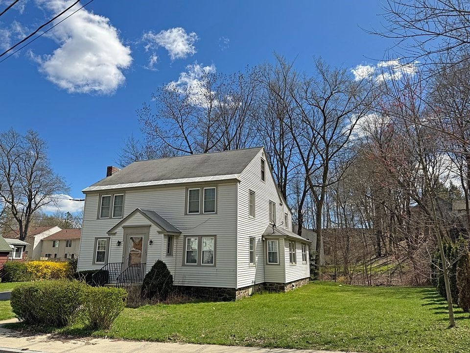 Well-maintained two-family home with good-sized sun-filled rooms, spacious living rooms, eat-in kitchens, two bedrooms in each unit, and an extra room on the first floor that can be used as an office or an additional bedroom. Wood floors on the first floor, and recently carpeted on the second floor. Vinyl-sided and vinyl replacement windows. Lead certified. (see attached documents). A full basement with an oil-fire boiler is separately metered. Updated electric, separate with 100 amps each. Three-car garage and an easy-to-maintain yard with woods in the back and a tree-lined side yard. Conveniently located within walking distance to downtown. Hurry, this one won't last. The seller requests offers to be submitted by 6pm Monday 5/22.