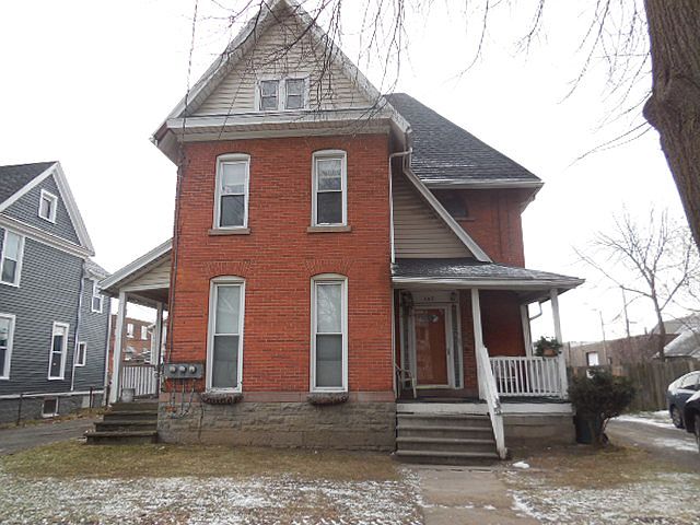 Two-family brick home. 5 bdrms/2 baths. 8 car garage. Extra lot included! Complete tear off architectural roof 2016. Ample parking. Separate utilities. 2 new furnaces 2016. 2 newer water heaters. Full basement. Both units have LR w/high ceilings & crown molding. Both have lg eat-in kitchens, gas stoves & refrigerators included. Ample closet space. (Source: RES 150)