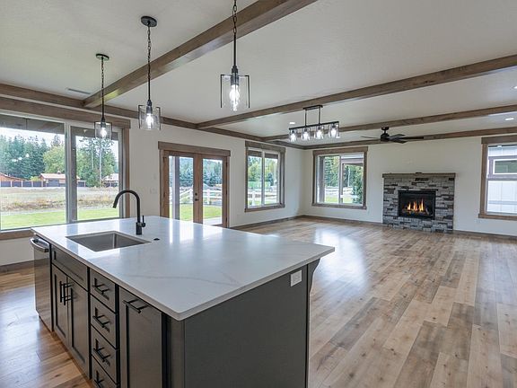 The Blacktail - Elegant Single-Level Living with Mountain Views Experience refined comfort in this 3-bedroom, 2-bathroom, 1,938 sq ft home featuring a stunning 1,200 sq ft wraparound porch with tongue-and-groove soffits and French doors—perfect for soaking in year-round mountain views. Inside, enjoy an open floor plan filled with natural light, luxury laminate plank flooring, and a cozy gas fireplace. The retreat-style primary suite includes a tiled walk-in shower, double vanity, linen storage, and a walk-in closet with built-ins. The gourmet kitchen boasts a large granite island, walk-in pantry, GE Profile appliances, and custom cabinetry throughout. Additional highlights include a landscaped lawn with sprinklers, a 3-car garage, and a durable 50-year composite shingle roof. Whether you're seeking a full-time residence or a vacation escape, The Blacktail offers elevated living with premium finishes in every corner.