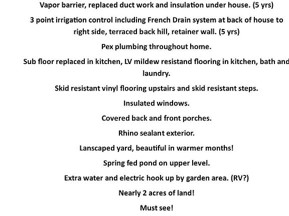 . This 3 BR/2BA home on nearly 2 acres is updated and ready for a new owner. Features include on main, eat in kitchen with appliances included. Updated flooring in much of the home. Upstairs find 2 large bedrooms and the other bath. Great front and back porches, watch all of the wildlife while you have your morning coffee! In spring and summer months, the land is beautiful with many flowers to enjoy. RV hookup & spring fed pond. This one is a must see! Occupied, need 24 hours notice to show. Subject to Seller finding suitable housing.