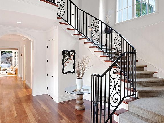 This Mediterranean estate is up a shady lane in Upper Happy Valley, removed from traffic and noise and yet with easy freeway access. The formal entertainment areas lie on each side of the foyer: a living room (with fireplace), and the dining room (seating 10 or more). Ceilings are 15-24 feet overhead, and hardwoods lie underneath. The oversized kitchen sits adjacent, featuring elite appliances, granite counters, an island with bar seating, dining area, skylight, and French doors to a patio and outdoor grill. The kitchen flows into the 506-sq-ft family room (with fireplace), which in turn accesses a terrace. Also on the main floor is a spacious office with fireplace and garden views. The principal bedroom, 432 sq ft, is on the main floor under an elevated ceiling. Its en-suite bath features dual sinks, a vanity, spa tub, oversized shower and huge walk-in closet. The other 4 spacious bedrooms and 3 bathrooms lie upstairs, along with a 500-sq-ft game room and wet bar (with refrigerator and dishwasher). The back yard features a terrace, deck, putting green and swimming pool. Parking is easy in two 2-car garages. Enter from a garage to a mud room, which adjoins the wine cellar. A gym is also off this garage. The tile roof affords fire protection, and the fire station is close by.