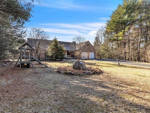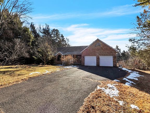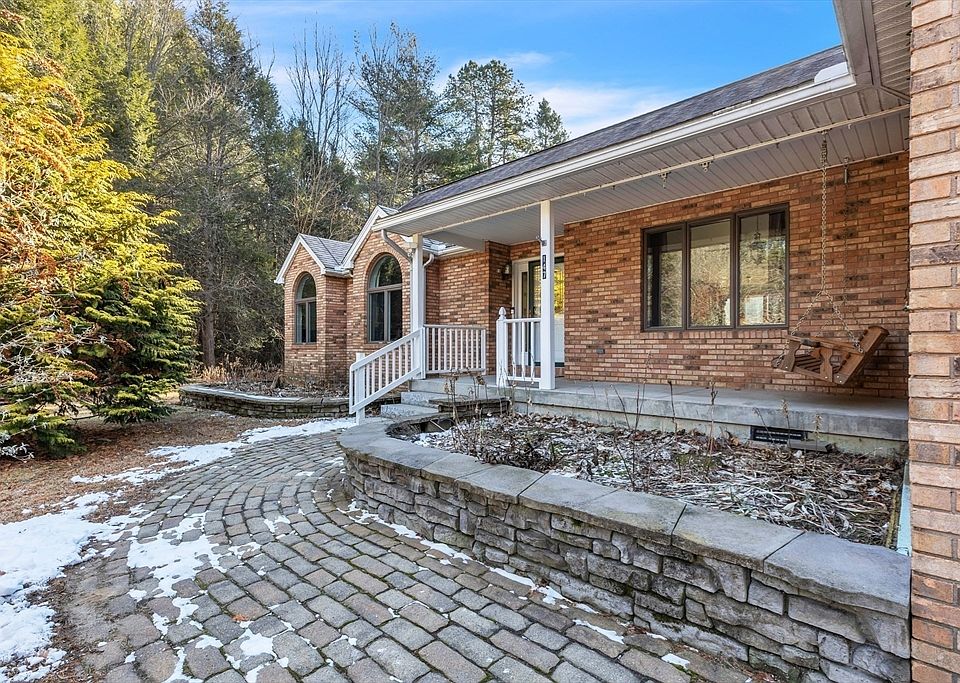 LOOKING FOR PRIVACY? This open-concept executive ranch, set on 5+ peaceful acres, offers 3 bedrooms, 2 baths, and vaulted ceilings throughout. Sunlight fills the kitchen, featuring granite countertops, a porcelain farmhouse sink, stainless steel appliances, a skylight, and a large island. The great room boasts a striking stone fireplace with a pellet stove insert and French doors to the back deck. The vaulted main bath includes a jacuzzi tub, while the spacious basement offers two semi-finished rooms, and space to expand. Enjoy the covered front porch with swing, framed by a garden and stone wall, or relax on the stone patio. Additional highlights include main-floor laundry, central A/C, central vacuum, a generator hook-up, tankless hot water, leased solar panels, an owned propane tank, and durable roof shingles(35-40 yr). With functional living spaces and serene outdoor areas, this private retreat is perfect for those seeking peace and comfort.