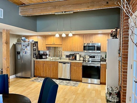 Living at its best! If you like the CONTEMPORARY style of beautifully exposed BRICK, rustic high BEAMED ceilings and oversized picture windows, look no further. The "LOFTS AT SOCO" are situated in the heart of Brockton...30 min. commute to South Station on the COMMUTER RAIL & BAT BUS are both located across the street, as is a central parking garage. This 5th floor unit boasts an OPEN FLOOR plan combination Living/Dining Rooms & modern Kitchen featuring SS Refrigerator, Stove, Dishwasher, SS TILE backsplash & laminate flooring throughout. This comfortable 2 Bedroom/2 Bath condo includes MASTER w/Full Bath & Walk-in Closet and GAS FURNACE ~ HOT WATER TANK replaced Aug. 2022 ~ C/A ~ large SECURE extra STORAGE in basement and 2 DEEDED parking spaces in the private, gated/fenced parking lot. On-site amenities include a private GYM & Function/Media Room that can be reserved for private gatherings. OPEN HOUSE is scheduled for Sunday, 4/16 12:00-4:00 pm.