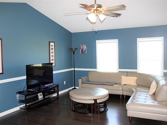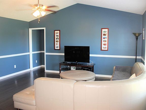- Living Room: Molding, Ceiling-Vaulted, Floors-Laminate, Ceiling Fan