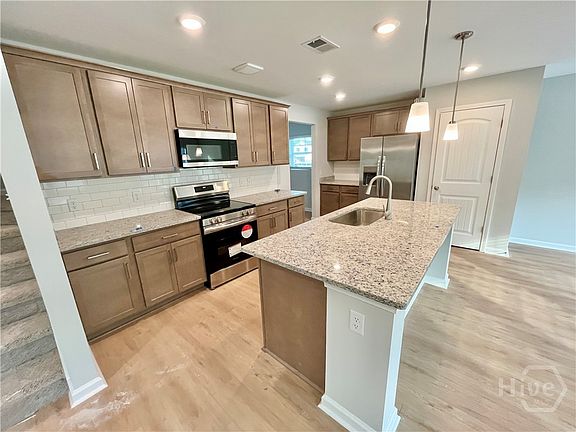 Savannah's Most Trusted Local Builder is Proud to Offer Our Bismarck II TR Plan. This Home's Dining Area, Family Room and Kitchen Are All Open. From the Garage Entry You Have a Powder Bath and An Area For A Drop Zone. The Kitchen is Upgraded With 36" Cabinets with Crown Molding, Granite Countertops, Tile Backsplash, A Large Island and All New Stainless Steel Appliances Including the Frig. Upgraded Vinyl Click Flooring Covers the Downstairs. Upstairs You Will Find Three Bedrooms Including Your Primary Suite Featuring a Large 5' Walk-In Shower, Double Quartz Vanity, Tray Ceiling and Large Walk-In Closet. Great Size Laundry Room with a Linen Closet and A Large Storage Closet In The Hall Complete The Upstairs. Wired For ADT Smart Home. Outside You Have a 16' x 12' Patio and Yard Complete with Sod and Irrigation. Estimated Completion June, 2025, Pictures, Features and Selections Shown Are For Illustration Purposes and May Vary From The Home Built. All Builder Incentives Applied.