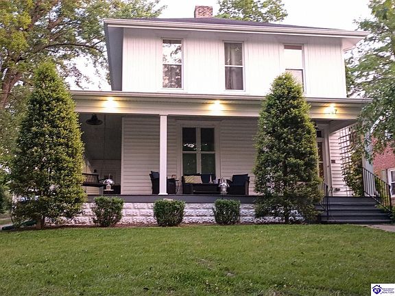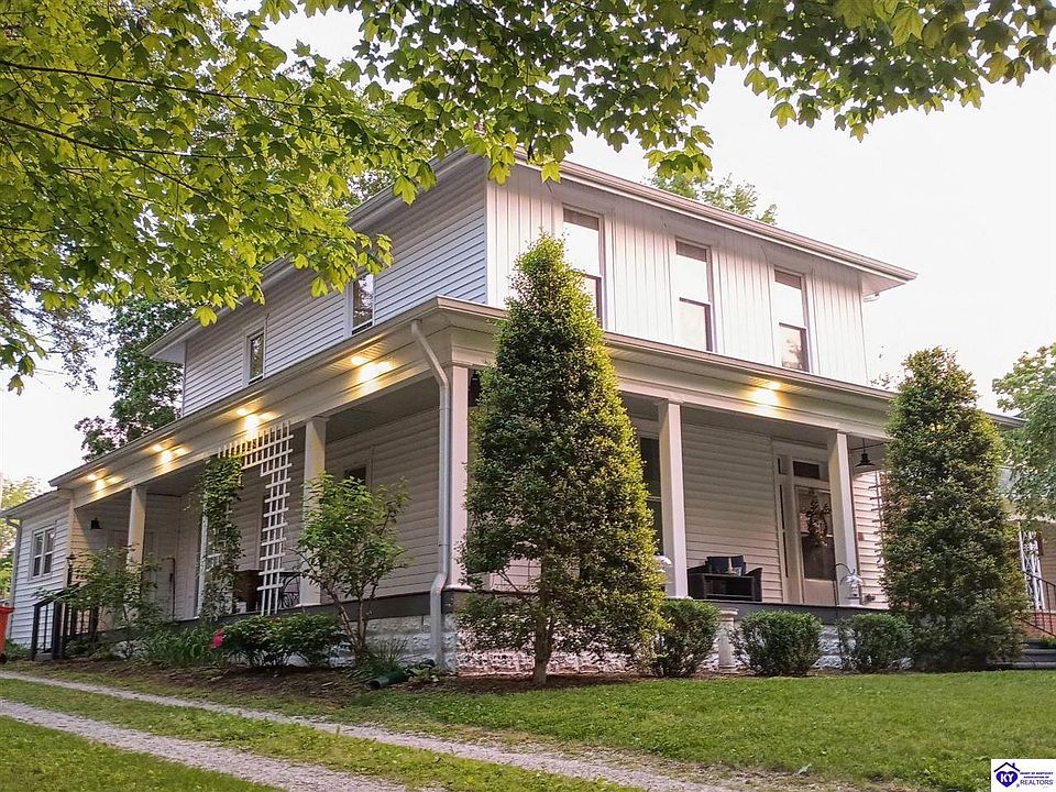 Charming Historic Farmhouse in the Heart of Glendale. Located on Main Street in the Glendale Historic District, this 2,200 sq. ft., 3 bedroom, 1 bath farmhouse sits on .3 acres and offers timeless character in a peaceful small-town setting. Listed on the National Historic Register, the home features original hardwood floors, 10-foot ceilings, and a classic wrap-around porch. The first floor includes a living room, family room, bedroom, full bath, eat-in kitchen, and laundry room. Upstairs offers two spacious bedrooms, a large walk-in closet, and an office nook. A detached two-car garage with workshop, fenced back yard, garden, compost area, and storage/playhouse building complete the property. Recent updates include vinyl siding, windows, lighting, and ceiling fans (2021). Located two miles from I-65 and near the new BlueOval SK battery plant. Walk to antique shops, restaurants, a coffee shop, park, and the popular Glendale Crossing Festival.