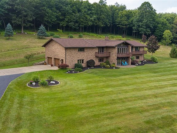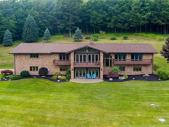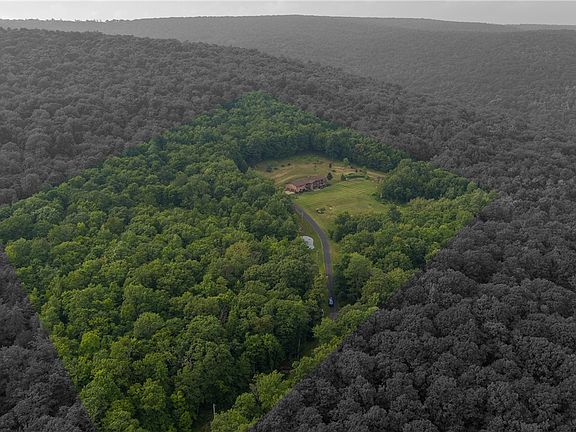 Tucked away on a sprawling 28+ acres lot at the end of a private drive! Step inside, you’ll be greeted by an inviting entryway, flooded with natural light. The kitchen is thoughtfully designed. Living room is a true gem, wood burning - stone fireplace, Glass walls - Leads to deck w a VIEW!!! The primary suite is a luxurious haven w/vaulted ceiling, soothing soaker tub and spacious double vanity. Adding to the luxury & romance is the two sided fireplace nestled between the BR and Bath. Two, large, additional bedrooms on the upper level w walk outs onto private deck. Fully finished lower level 2 bedrooms. Open Fam Rm has a stone wall fireplace & patio walkout, & connects with the wet bar area. Oversized 2 car integral garage. Plenty of space to walk, ride or play on this sprawling 28+ acres. This is a Private Paradise, surrounded by state game lands. Natural rock outcroppings, and 2 ponds w fountains.