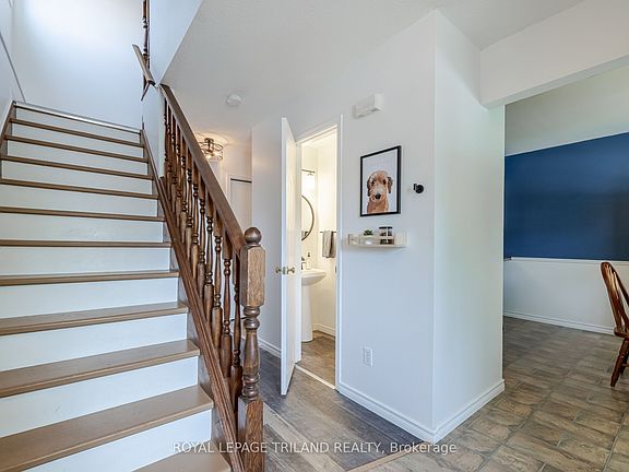 Welcome to this charming 2-storey semi-detached home, ideally located on a quiet crescent in the sought-after Glen Cairn Woods neighbourhood. This move-in-ready gem offers a blend of style, function, and outdoor living - perfect for families, first-time buyers, or investors alike. The full brick façade on the main level and maintenance-free siding on the second floor provide timeless curb appeal. A long asphalt driveway (updated in 2020) accommodates three vehicles. Step up to the inviting front porch, and enter a bright main floor featuring a spacious eat-in kitchen with professionally repainted white cabinetry (2025), subway tile backsplash, and stainless steel appliances. The open-concept living/dining room at the rear of the home is ideal for entertaining, with direct access to the fully fenced backyard through an updated sliding patio door (2020). Outside, enjoy the expansive sundeck with included gazebo and a custom storage shed for added convenience. A stylish updated 2-piece bath completes the main floor. Upstairs, you'll find laminate flooring throughout three generous bedrooms, including an oversized primary retreat. The updated 4-piece bath features modern tilework, a glass tub surround, and an elevated vanity. The finished lower level offers a large rec room, updated 3-piece bath, and a spacious laundry/storage area. Major updates include: furnace & central air (2018), electrical panel, most windows, and more. Located just minutes from the 401, Victoria Hospital, parks, ponds, schools, and trails - this home is the perfect balance of comfort, convenience, and community. Don't miss it!