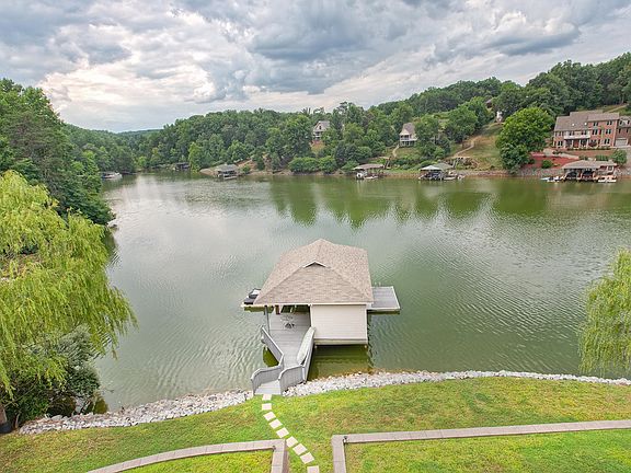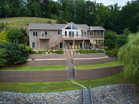 Private, Quiet and Secluded Lake Home on 5 acres with 391 ft of shoreline. Beautiful 3 bedroom (decorated as 4) with 3 full baths and 2 kitchens allows you to live upstairs or down. Spacious 2 slip boat dock with 2 jet ski ports. Beautifully landscaped with terraces and paver steps to the dock.