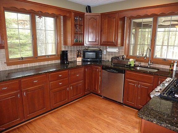 Custom built LAKEFRONT home with a beautiful view on a quiet lake; Master Bdrm suite, Liv Rm, Din Rm, Kitchen & garage all on one level with no steps.This home has plenty of room for friends & family: 5 bedrooms, 3.5 baths; den; stone fireplace in LR; full finished walk-out basement, family room, custom cherry cabinets in kitchen; 12' x 18' screened in porch, deck, 2 car garage, lake views from most rooms, PLUS...an available dock slip on Lake Wallenpaupack.