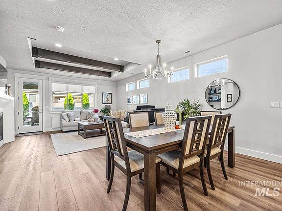 Better than new, this stunning custom home on a desirable corner lot in Estrada Village showcases exceptional design and quality throughout. Featuring 9’ and vaulted ceilings, LVP and tile flooring, and an open, light-filled layout, this home is built for both comfort and style. The chef’s kitchen boasts Bosch appliances, quartz countertops, a full tile backsplash, custom cabinetry, and a spacious walk-in pantry. The inviting living room offers a gas fireplace with built-in cabinets and striking wood beam accents. The private master suite includes a beautifully tiled walk-in shower, quartz vanity, and generous closet space, while the second bedroom enjoys its own private bath with a tub/shower combo. Outside, the low-maintenance yard and covered patio provide the perfect place to relax and entertain. Estrada Village is a thoughtfully planned community conveniently located near all of Eagle’s premier amenities. Don't miss this one!