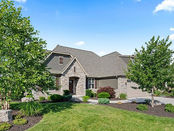Gorgeous custom built ranch on serene wooded lot in Sagamore Subdivision! This 4 bedroom home offers nearly 4000 finished sq ft including bonus room above garage & finished walkout basement. Open great room boast 10 ft coffered ceiling, gas fireplace flanked by built-in shelves & cabinetry, & hand scraped HW floors. Kitchen includes stainless appliances, quartz countertops, subway tile backsplash, walk-in pantry, & opens to eat-in dining area. Entertain or relax on the spacious composite deck (15x16) overlooking amazing views. Master suite has tray ceiling, walk-in closet, & en suite bath w/ beautiful tile shower & free standing tub. Bonus loft above garage provides extra space perfect for home office! Finished basement has spacious rec room, 4th bedroom w/large walk-in closet, 3/4 bath, & huge unfinished storage room. Additional bedroom can easily be added & there is already rough-in for wet bar. Walkout to lower level patio & fenced yard! Award winning schools and low taxes!