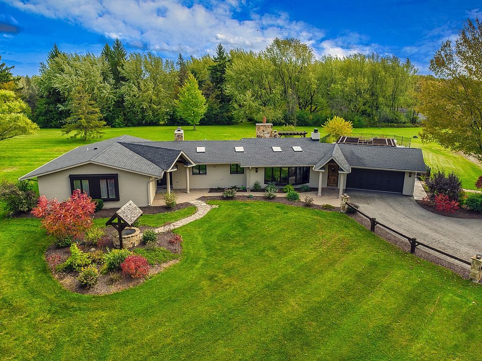 Sweeping lawns and a beautiful wooded backdrop are the perfect setting for this exceptional, light filled ranch home set on a stunning 5.1+ acre lot. The thoughtful, open floor plan is perfect for entertaining and oversized windows offer spectacular views of the natural setting. The resort style rear yard features an in-ground pool and large outdoor entertaining area. Stylish, custom finishes, fabulous updates and fresh paint throughout make this home luxurious yet cozy. Family room with vaulted, beamed ceiling, skylights and a lovely fireplace is a wonderful spot to gather. A delightful sunroom is the perfect spot to enjoy your morning coffee or evening cocktails. The sun-drenched gourmet kitchen is a delight for any chef with custom cabinetry, newer top-of-the-line appliances and opens to the elegant dining room with custom lighting. A double door entry welcomes you to the gracious primary suite with luxe bath and sliders to the rear deck. Two spacious secondary bedrooms and spa like hall bath are also found on the main level. Downstairs, the finished lower level with large rec and media rooms, wet bar and wine cellar is a great entertaining option. A fourth bedroom, full bath and laundry room round out this well-appointed space. The amazing outdoor living area is a private oasis - enjoy summer days splashing in the pool and cool evenings around the fireplace. An outdoor kitchen area with built-in grill and smoker makes cookouts a breeze and the pergola is a great spot to dine al fresco. A brick walkway leads to the renovated 3,000 sq. ft. pole barn featuring an adorable one-bedroom guest house with kitchenette, full bath, office and exercise room. The adjoining bonus flex space is simply incredible! Oversized garage doors, radiant heated epoxy flooring and space for 12 cars makes this a car enthusiasts dream or flex to use as a sports court or workshop - the possibilities are endless! Separate 3 stall barn. Enjoy space and privacy with easy access to town, train, shopping & restaurants. Don't miss this special property!