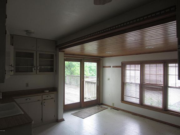 Nice little house! Has a large yard and garage and a large deck off of dining room. Wood burning fireplace and stained glass window in the living room. The 2 upstairs bedrooms have gorgeous original hardwood floors and decent closets. Kitchen offers lots of cabinets and two sinks!