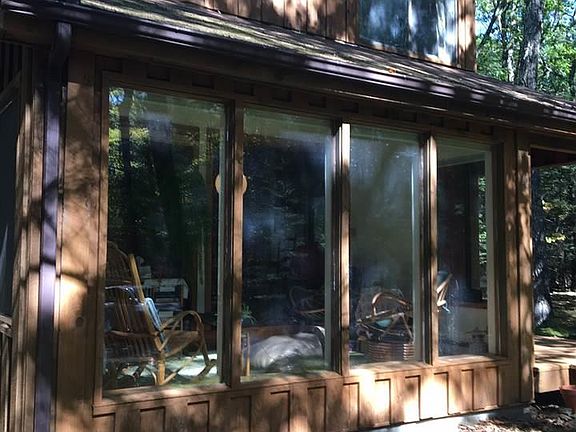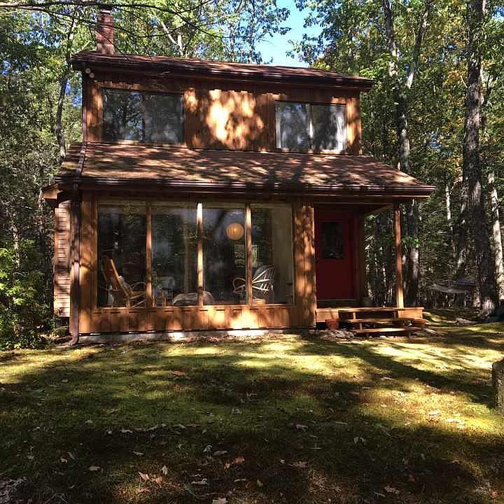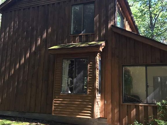 Set back on a quiet country road 1 mile from the village of Woodstock on 3 acres surrounded by oak & pine trees sits this charming rustic house. Designed with Whole Earth ecology principles in mind, the house faces south for passive solar energy and the glass enclosed sunroom provides a great place to hang out and observe the deer, birds and wild turkeys sure to pass by. The house has been used for 30 years by the same family, only for weekends and vacations. The house is framed with 2x6 for 6" insulation in the walls and 12" insulation in the attic. All interior water pipes are located in one central insulated wall to protect against frozen pipes. Additional features include: double glazed windows with insulated shades and a Vermont Castings wood stove... and there is electric baseboard back-up heat. There are exposed beams with finished oak floors downstairs and pine ship decking upstairs. Interior of house freshly painted.