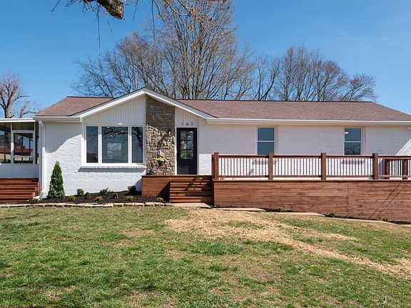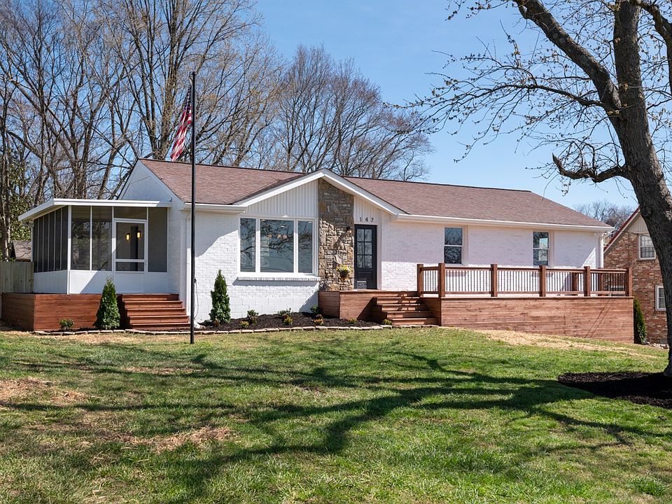 Enjoy the views of Old Hickory Lake from the front porch of this newly renovated raised ranch in Hendersonville. This charming 1960's brick home has 4 bedrooms and 3 full baths. The main floor features an open living/kitchen/dining space. New kitchen w shaker cabinets, quartz countertops, tile backsplash and new stainless appliances. Finished basement level has bonus/family room w mud area off rear entry, dedicated laundry room, primary suite w large walk-in closet and new bath w marble dbl vanity and tile shower. Upgraded finishes like LED recessed lighting, refinished hardwoods, new tile, new hardware, fresh paint, storage closets and more throughout. Attached one car garage, large fully fenced backyard w drive-through gate. Plus, updated screened side porch to enjoy the outdoors. New landscaping completes this move-in ready home that's awaiting its next owner! Great location walkable to Walton Ferry Boat Ramp area, close to Sanders Ferry Park, new lakeside walking trail and more!