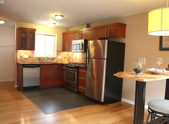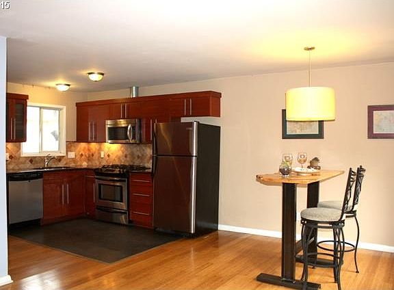 Beautifully remodeled midcentry condo in sought after Montavilla. Upgrades include bamboo floors, gourmet kitchen w/ SS appliances, granite slab, remodeled bath. Open great room concept w/ spacious living areas, gas fireplace. Attached storage, fenced patio, only one shared wall, assigned parking. Ideal location, quiet street. Close to Farmers Market, thriving business dist, Mt Tabor, Bus lines. HOA covers all utilities but power & gas.