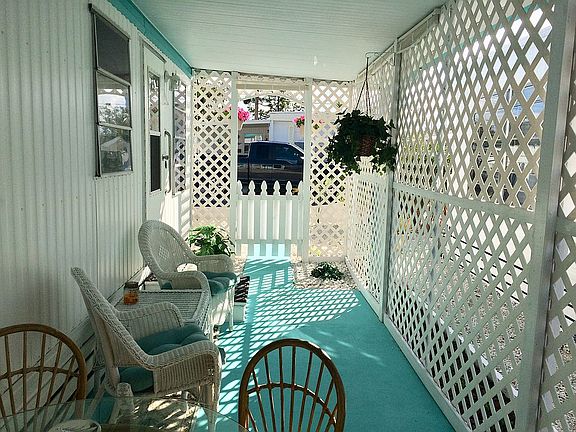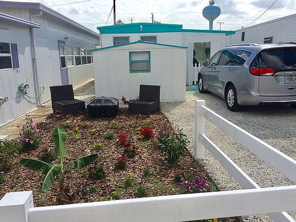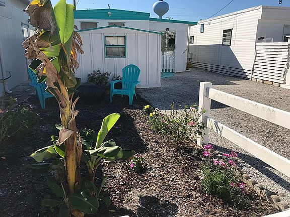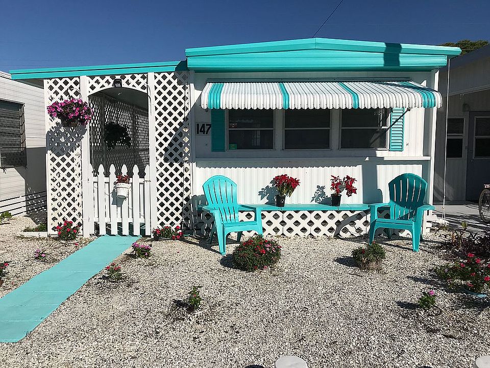 ON THE ISLAND. Turn key — everything you need to start life in Paradise — linens, towels, dishes, furniture, etc. Walking distance to beach, downtown, grocery/bank/pharmacy -- all between 1/2 to 3/4 mile -- don't even need a car. Florida-decorated -- light and airy; 30' open lanai; shed; parking for 3 cars; large garden; no neighbors in back; near laundry and clubhouse. HOA includes land rent.