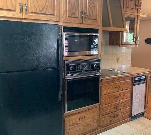 - Kitchen: Refrigerator, Tile, Cooktop, Oven, Dishwasher, Microwave
