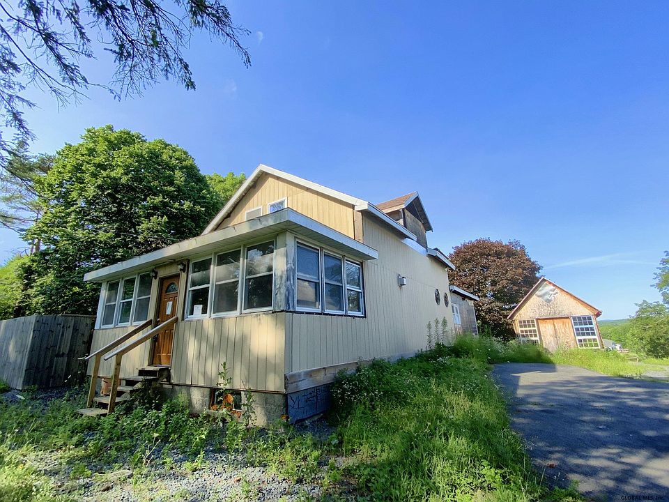 Idyllic country setting yet less than 5 minutes away from amenities. This house is so much bigger than it looks from the outside! Someone had some great vision and had started creating a really neat open floorplan. The rooms are huge, & with part of the ceiling opened up in the main living area the space just feels really open and airy. Gorgeous wood & beam ceilings add to the charm. Pretty views from the back yard go for miles to the mountains in the distance. If you are in need of even more living space inside, the basement is just waiting to be finished. It looks as though it was started at one point. Possible first floor bedroom. There is so much potential in this house and some of the work has already been done. Large barn-style garage is great for all of your outside storage needs.