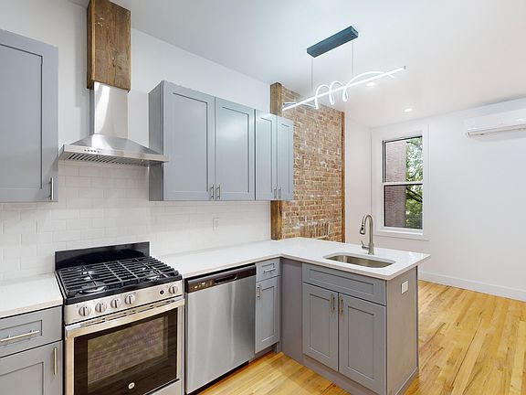 Gut Renovated | 2 Full Bedrooms | 1 Bathroom | High Ceilings | Stainless Steel Appliances | Central Air | Close to L and JZ Subways 1470 Bushwick Ave is undergoing a transformation! Brand new, gut renovated, true 2 bedroom, 1 bathroom apartment. Perfect for roommates or a family looking to live in a clean, new apartment. This beautiful home has a wraparound ceaserstone countertop, a stainless steel appliance suit (with a dishwasher!), a true outdoor vented hood and abundant storage. Both bedrooms have large windows, built-in closets, and high ceilings. All spaces have separate heating a cooling that can be individually controlled to your liking. Thoughtful finishes such as exposed brick and re-purposed wood beams, LED fixtures throughout and an efficient layout will add to your everyday living pleasure. There are also brand new, hardwood floors throughout as well as new plumbing and electrical. No more pesky mechanical issues! The building will feature a modern, video intercom system and a camera system throughout. The basement will feature a paid washer/dryer for your use as well as storage units for an additional cost. This apartment is individually metered for gas and electric. Photos are of the actual unit