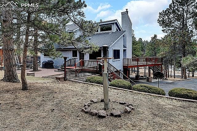 Immaculate move-in ready custom home in Woodmoor situated on over of an acre lot with tall Pines trees and views of Pikes Peak. Updated gourmet kitchen includes stainless steel appliances, gorgeous slab granite countertops with stack stone breakfast bar including seating, laundry and pantry area and a spacious dining area with views of the forest. Huge vaulted great room with track lighting, floor to ceiling stone woodstove, hardwood floors, an accent wood wall and plenty of windows for natural light plus a walk-out to the deck. Completing the main level are two additional bedrooms with Jack & Jill bath and updated powder room with wainscoting. Encompassing the upper level is the spacious master retreat with hardwood floors, vaulted ceilings and private bath. Lower level features a family room with garden windows, new floors & walls in 2021 and easy access to the insulated garage plus a soundproof office. Newer windows, new boiler in 2020, tankless water heater, new roof in summer of 2021, beautiful landscaping with flower gardens, multiple patios and a huge wrap around deck to enjoy the Colorado evenings. A must See!