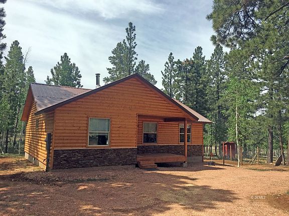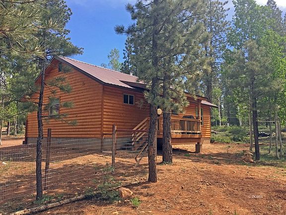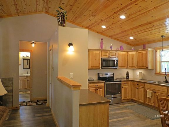 Evidence of pride and craftsmanship are evident in this cabin's finish. Shows like new! Desirable single level construction with 660' 3 car detached garage. Kitchen features hickory cabinetry and Whirlpool appliances. Cabinets have pots & pans slideout drawers. Plumbed for dishwasher. Convection oven. Low texture drywall finish is set off with warm tongue in groove ceiling wood and trim. Master bedroom features walk in closet, adjacent 3/4 bath with spacious walk in shower, and linen closet. Two more guest bedrooms on the other side of the cabin offer ample room for your guests, with a full bath featuring a marble look tile shower. New wood stove with blower and baseboard heat will keep you plenty warm on chilly days. 4' crawlspace is insulated and graveled. Washer & Dryer hookups. Back deck is Trex/Cedar and offers a wonderful place to look out into the National Forest at towering ponderosa and aspen that grace the area. Solid core vinyl flooring & nylon carpet which holds up to wear well. Windows are outfitted with pulldown blackout shades. The lot is absolutely stunning- level with circular driveway and RV septic connection. 3 car garage. Offered mostly furnished. A must see!