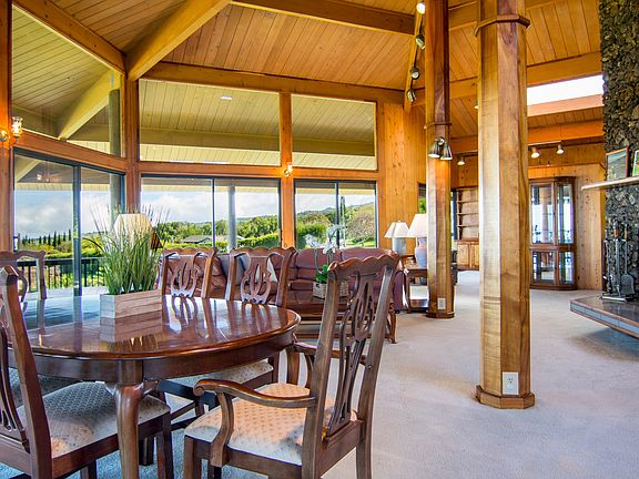 Stiller designed pole house at 1800 foot elevation with bicoastal views. Gorgeous high ceiling of timbers imported from Alaska. Architectural gem. Hawaii Koa cabinets. Large grassy area and many mature colorful plantings front and back. Circular driveway. Solar panels on roof. Two floors with book matched floor plans, two en suite bedroom, separate bath in hallway on each floor. Full kitchen, great room, fireplace, large lanai. Almost at the end of Naalae Road with no through traffic. Renter is responsible for utilities (water, gas, garbage, electric). Minimum lease one year. No smoking. Parking only in designated areas. No subletting. NO access to farm or cottage on the property.