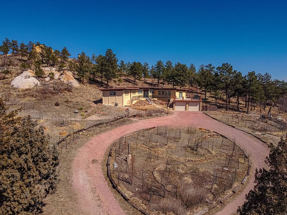 Nestled in the breathtaking landscape of western Colorado Springs, this beautifully remodeled open-concept ranch sits on large acreage in highly sought-after Woodmen Valley. Enjoy the award-winning Academy District 20 schools while immersing yourself in the natural beauty of the area, complete with unique HooDoo rock formations, scenic walking trails, and frequent visits from friendly mule deer. The recently renovated kitchen is a chef's dream, featuring two expansive breakfast bars, high-end appliances, and elegant granite slab countertops-all designed to showcase the sweeping views of Pikes Peak and the picturesque Colorado foothills. LED wafer lighting and skylights flood the home with natural light, creating a warm and inviting atmosphere. The spacious living room, just off the kitchen, boasts large windows and LED light tubes that highlight the stunning surroundings. Step outside to the patio, where you can entertain guests against the backdrop of breathtaking mountain views. The remodeled bathrooms exude luxury, with sleek cultured marble finishes. Designed as a gardener's paradise, the property offers a unique combination of well water for landscaping and city water for the home. The thriving gardens feature heirloom and red-fleshed apples, cherries, peaches, pears, and nectarines, along with garlic ready for a July harvest. Vibrant blooms-including irises, daffodils, hibiscus, Russian sage, ice plants, and Kentucky peppermint-enhance the landscape throughout the growing season. The new septic system is sized to handle an extra bedroom if you wanted to expand the home. Property zoned to allow an auxiliary dwelling unit on the property with a deed restriction not allowing rentals. Meticulously maintained with new luxury vinyl flooring and fresh paint throughout. This gorgeous home comes with a new furnace and central AC, a new water heater, and a recently installed septic system. A rare opportunity to own a private retreat that blends modern comfort with Colorado's natural splendor.