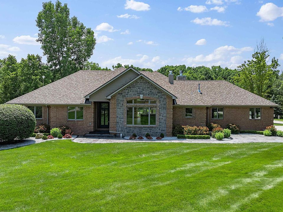 Stunning designer showcase great room ranch on 3.3 acres with 90' x 40' heated barn and scenic pond. Over 5,000 sq. ft. of finely appointed living area in this recently completely renovated home (Seller has invested over $1.2M in recent renovations & has hardly lived in home) The home has been finished with only the finest materials and craftmanship, the attention to detail in this home can only be appreciated by a discriminating Buyer. Entertainers' gourmet double island kitchen with built-in commercial grade appliances; Nice open floor plan with walls of windows overlooking private acreage and pond; Large owner's suite with luxury bath; Open wrought iron staircase to full finished lower level with 2nd full kitchen, 4th bedroom, full bathroom and open entertaining area. 600 ft concrete driveway leading to 90' x 40' heated barn with finished balcony, 2 12ft doors, half bath, upper deck overlooking pond. Huge outdoor entertaining area with covered patio with fireplace; huge stained concrete patio & hot tub area. Oversized generator will service whole house and 3600 sq. ft. barn. All tile floor areas in home have radiant heat. Heated 3.5-car attached garage. Home is on artesian well that feeds to pond with fountain. Beautiful white oak hardwood flooring throughout most of 1st floor. Immediate possession. Great setting!