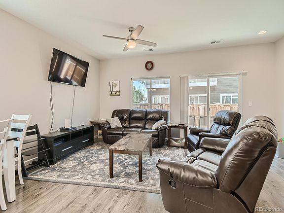 Live large in this two-story townhome with an open floor plan. Owners are original (2019) and they’ve taken great care of the home. It's an end unit with tons of south light. Entry foyer opens to large open kitchen with eating space at the bar. Dining room flows from the kitchen to the spacious living room – big enough for entertaining or relaxing. Enjoy the outdoors on the patio of your private, fenced backyard. First floor also has a powder bath for convenience. Primary bedroom suite on the second floor includes a dual-sink bath, walk-in closet, vaulted ceiling and plenty of light from the many windows. Two additional good-sized bedrooms, full bath and laundry round out the second floor. Park off-street with one assigned parking space with an opportunity to rent another. Conveniently located near shopping, Reunion’s amenities, Rocky Mountain Arsenal Wildlife Habitat, DIA and has easy access to major highways.