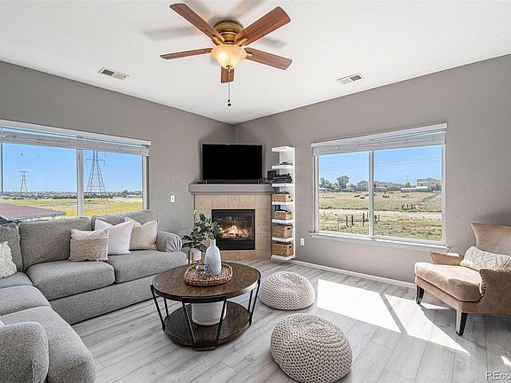 Move-in ready condo waiting for you! With amazing mountain views and fantastic updates, the open floor plan provides a place to gather with friends and family, or relax on a quiet night at home! Large windows let in an immense amount of natural light, highlighting the beautiful flooring that runs throughout the main living space! The living room is equipped with a cozy fireplace for those cool nights, and the adjoining kitchen and dining area is great for entertaining with a kitchen island and built in bar area! Both the bar and laundry area feature gorgeous, built-in wood shelves to provide additional storage space! The guest bathroom has been updated with a modern vanity and sink! Heading into the primary bedroom, you find a large space perfect for rest and rejuvenation with a walk-in closet and ensuite bath! The second bedroom also has an ensuite bath, providing plenty of space and privacy for everyone! A King Soopers Marketplace across the street allows for easy access to shopping, and additional dining nearby. Nearby recreation opportunities abound with Second Creek Open Space and Fronterra Park less than 5 minutes away with walking paths to explore the area, and Barr Lake State Park is only 15 minutes away where you can also engage in water sports! Dick's Sporting Good Park is also 15 minutes away for soccer games and concerts and you can be at DIA in less than 20 minutes to catch a plane! I-76, Highway 85, and E-470 are all nearby to take you to Denver, the mountains, or anywhere north or south quickly and easily! The convenient location adds to what makes this condo wonderful!