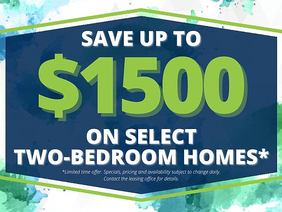 - Special offer! Save up to $1500 on select two-bedroom homes! *Limited time offer. Specials, pricing and availability subject to change daily. Contact the leasing office for details.