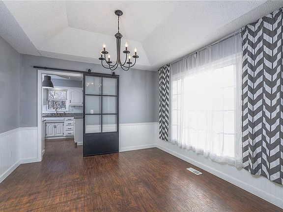 Quaint raised ranch on a cul-de-sac and on a BIG lot! The home features a dining room with wood floors, large window and barn door separating it from the kitchen. Kitchen with painted cabinets, granite counter tops, wood flooring, pantry, custom lighting and small eat-in area. The great room has a fireplace, wood flooring and vaulted ceiling. The family room in the lower level is big, daylight and has a wet bar with small frig. There is also a room in the lower level that can be used for an office. This lovely home has a huge, fenced backyard.
