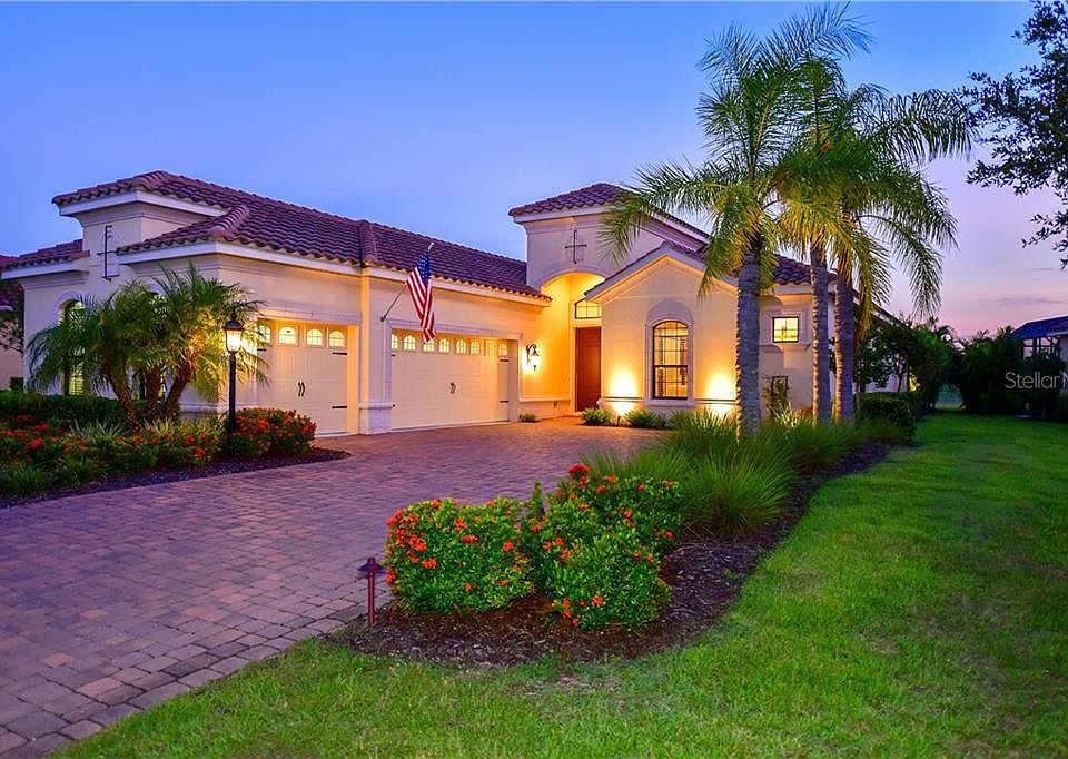 Live beautifully and call this stunning home your own. The clean lines and easy yet refined feel of the layout envelop you; putting you at ease while simultaneously lending a pinch of grandeur to your every day! As you enter the 3 bedroom, 3.5 bath + den home, the well appointed details and subtle luxuries placed throughout the 2,713 sqft of interior space are breathtaking to guests and homeowners alike. The open floor plan blends chef's dream kitchen with living and dining spaces, boasting an upgraded appliance suite in the kitchen area including GE Monogram appliances, 6-burner gas range, granite countertops, and oversized kitchen island. Additional upgrades throughout include neutral tile flooring in the common areas, crown molding, tray ceilings, upgraded premium ceiling fans, upgraded bathroom fixtures, and wood flooring in the den. The master suite is a private oasis with windows overlooking the stunning pool framed by lush vegetation and golf course views, two walk-in closets with cabinetry, dual sinks and large walk-in shower. Open up the living room sliders onto the oversized premium paver lanai, featuring a sparkling screened-in private pool with 180 degree views of the fairways. Additional features include a 3 car garage and tile roof. Don't fret about the lawn - this is a maintenance-free community! Lakewood Ranch offers residents the ultimate in Suncoast living with a Private Country Club, 4 golf courses, athletic facilities, and miles of walking trails.
