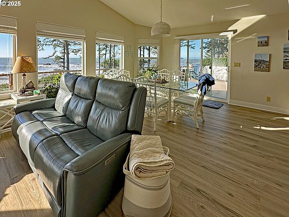 LET'S GO TO THE BEACH FROM THIS FURNISHED BEACHFRONT HOME! PRIVATE DEEDED BEACH ACCESS! 3 bedrooms 2 baths. Grand views of sandy beach, kitchen, living room, dining area and new deck. Primary bedroom features jetted tub, walk in shower, double sink vanity and a walk-in closet with organizer. Bright second bedroom, third bedroom with murphy bed. Sit out on the new deck with cable railings and catch the beautiful coastal sunsets that take your breath away. Pantry, 2 car garage with a mini garage for storage or shop. Bonus- a distant view of St George Lighthouse.